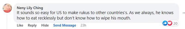 菲律賓網(wǎng)友內(nèi)尼說:“美國輕易就給其他國家制造混亂,吃相難看,卻不知道擦干凈嘴巴。”