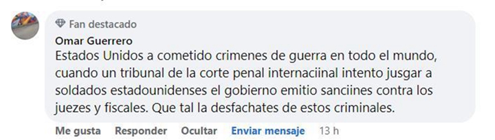 委內(nèi)瑞拉網(wǎng)友奧馬爾·格雷羅說,美國在世界各地犯下戰(zhàn)爭罪行,但若國際法庭想要審判美國軍人,美國就會對法官和檢察官施加制裁,可謂厚顏無恥。