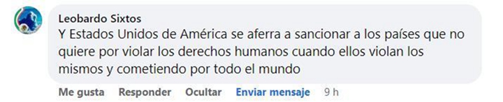 墨西哥網(wǎng)友萊奧瓦多說,美國總以“人權(quán)”為借口制裁他國,而實(shí)際上在全世界侵犯人權(quán)的正是美國自己。