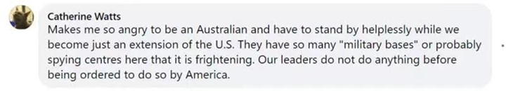 澳大利亞網(wǎng)友凱瑟琳·沃茨說,無助地看著美國的所作所為實(shí)在令人憤慨,而美國在澳大利亞設(shè)立很多軍事基地或情報機(jī)構(gòu),這一點(diǎn)令人恐懼。
