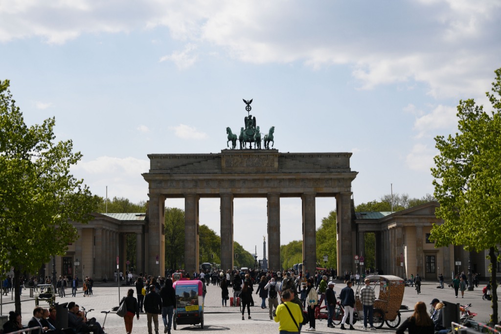4月28日,游客在德國柏林勃蘭登堡門東面的巴黎廣場上游覽。(新華社記者任鵬飛攝)