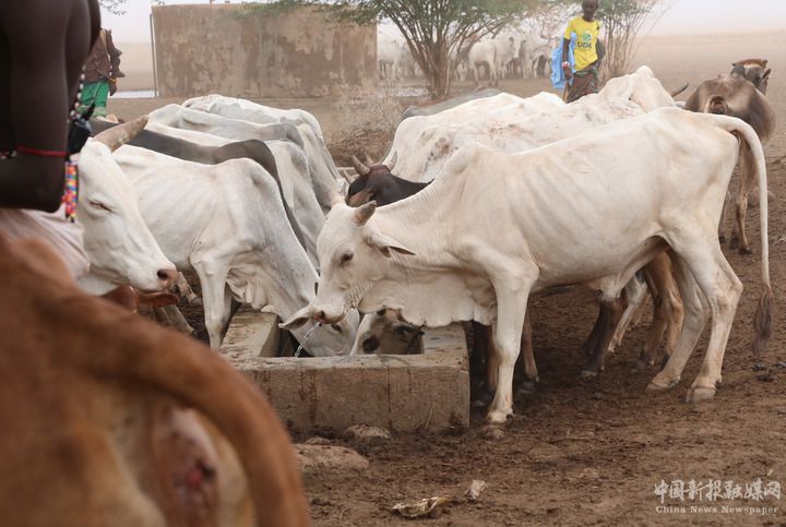 該郡萊薩米斯地區(qū)的一處大型飲水點,是地區(qū)內(nèi)約1000名牧民和數(shù)萬頭牲畜賴以生存的水源。大批牛群和羊群從各方趕赴這里,牧民們不斷使用長棍驅趕牲畜以維持秩序。