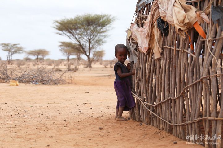 8月26日,一名兒童站在肯尼亞馬薩比特郡萊薩米斯鎮(zhèn)一干旱的村莊內(nèi)。新華社記者董江輝攝