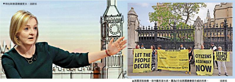 左圖:特拉斯勝選機(jī)會(huì)更大。\法新社 右圖:英國(guó)深陷危機(jī),保守黨民望大跌,圖為2日在英國(guó)議會(huì)前示威的民眾。\法新社