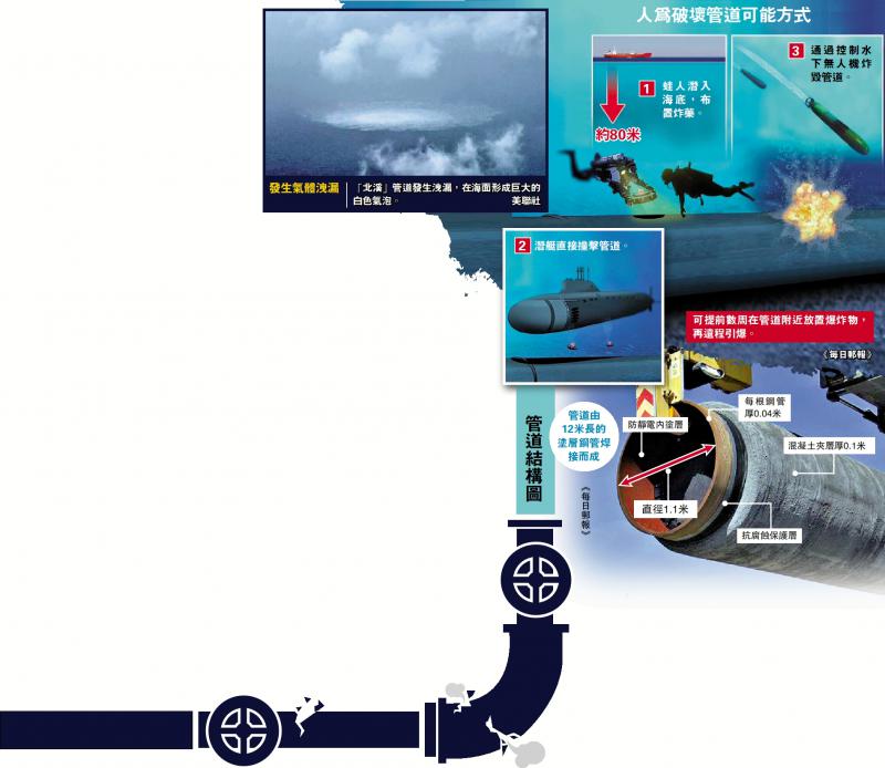 可能是潛水員或小型潛艇在管道上安裝了水雷或炸藥,再通過(guò)無(wú)人機(jī)遠(yuǎn)程引爆炸藥。