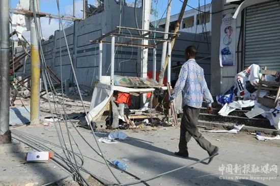 10月30日,在索馬里首都摩加迪沙,當?shù)鼐用褡哌^爆炸現(xiàn)場。圖源:新華社