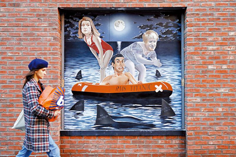圖:英國(guó)街頭的一幅藝術(shù)畫顯示,首相蘇納克(中)等人在危機(jī)中掙扎。\美聯(lián)社