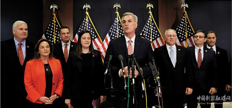 圖:眾議院共和黨領(lǐng)袖麥卡錫(中)15日在國(guó)會(huì)大廈見(jiàn)記者。\路透社