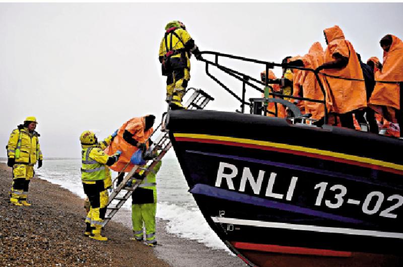 圖:英國最高法院19日裁決轉(zhuǎn)運(yùn)難民前往盧旺達(dá)項(xiàng)目合法,圖為本月9日一艘抵達(dá)英格蘭的難民船。 法新社