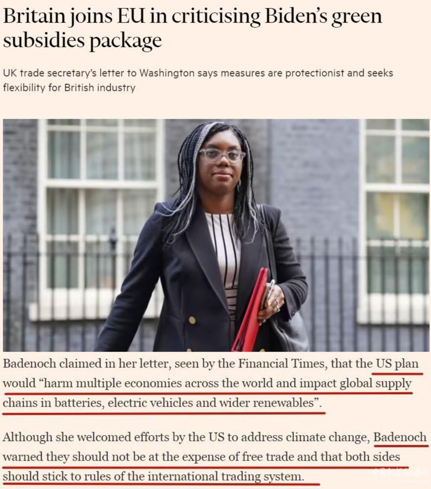 英國國際貿(mào)易大臣凱米·巴德諾赫日前致信美國貿(mào)易代表戴琪,批評美國的《通脹削減法案》將“損害全球多個經(jīng)濟(jì)體,并影響電池、電動汽車和更廣泛的可再生能源領(lǐng)域的全球供應(yīng)鏈”。