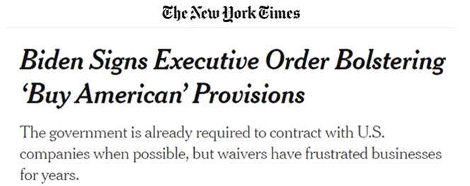 《紐約時報(bào)》:美國總統(tǒng)拜登去年1月就職后就簽署行政命令支持購買美國貨,以幫助美國公司更容易擠掉外國競爭對手。