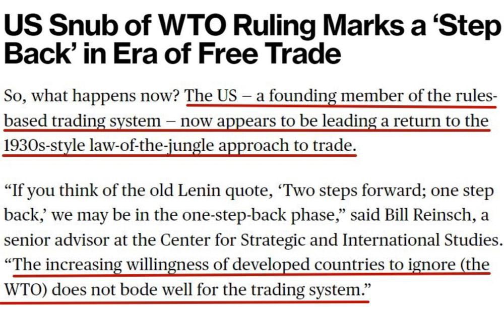 正如彭博社評論文章所擔(dān)憂的:作為以規(guī)則為基礎(chǔ)的多邊貿(mào)易體系的創(chuàng)始成員國之一,美國現(xiàn)在正帶頭回歸上世紀(jì)30年代那種弱肉強(qiáng)食的貿(mào)易方式,“這對多邊貿(mào)易體系來說不是好兆頭”。