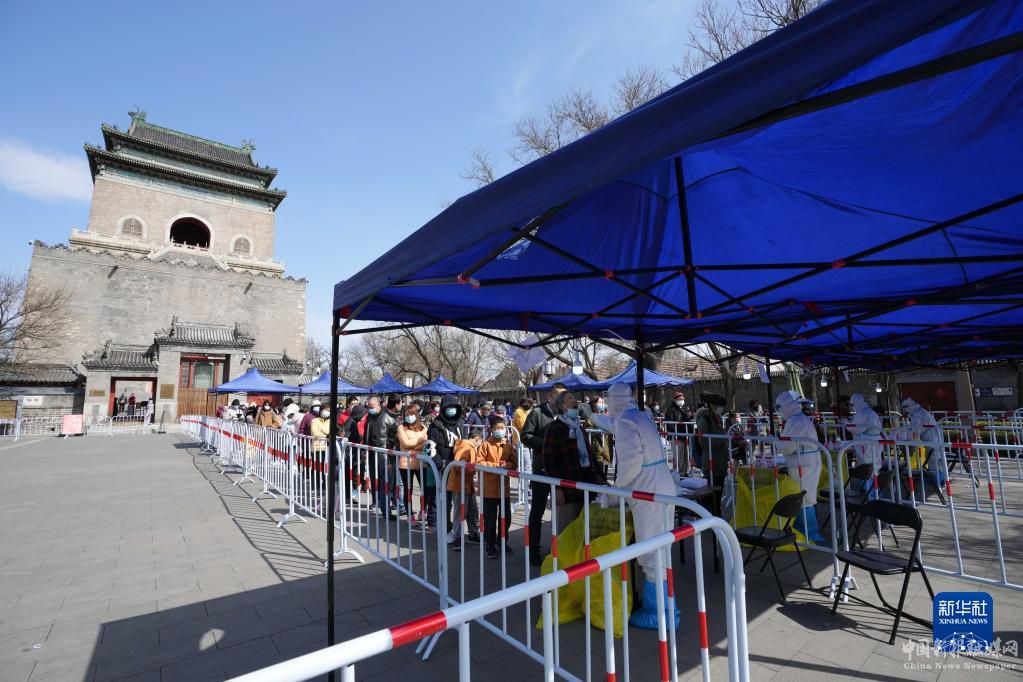3月21日,在北京市東城區(qū)安定門街道鐘鼓樓文化廣場核酸采樣點,醫(yī)護(hù)人員為居民進(jìn)行核酸采樣。