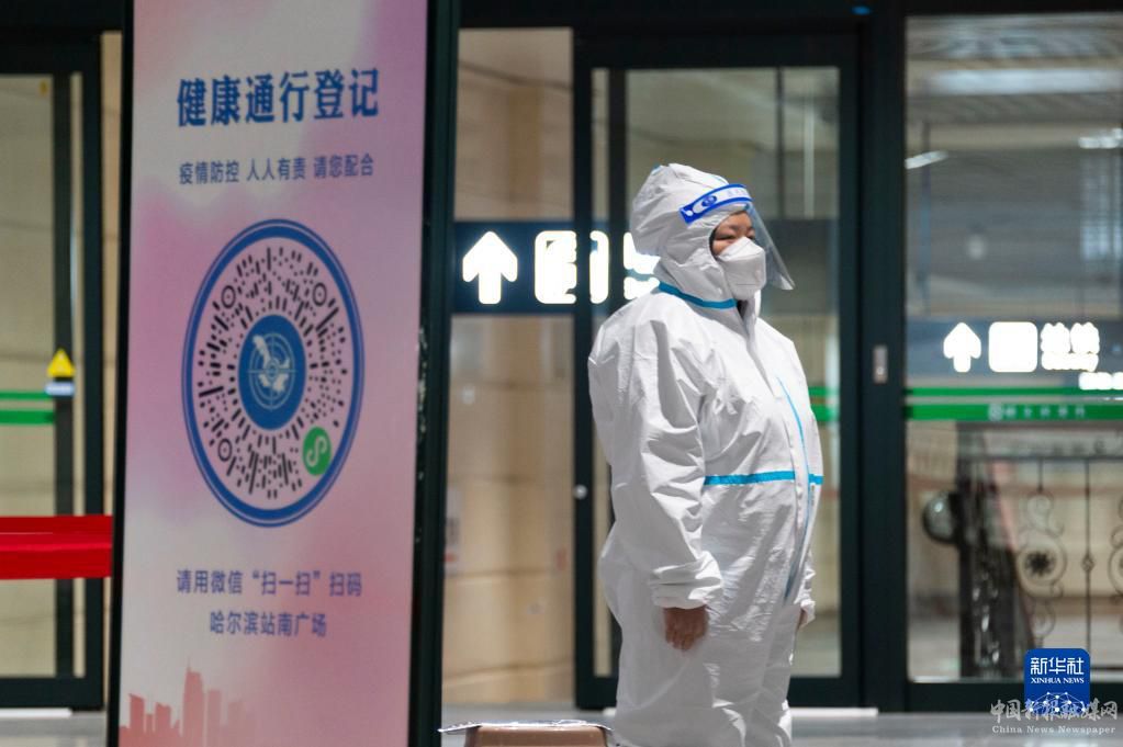 3月21日,工作人員在哈爾濱站南廣場(chǎng)進(jìn)站口值守。