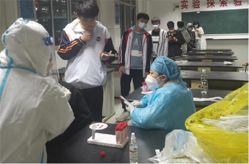 3月21日早上8點,核酸采樣人員分別到達采集地點,穿戴好防護服,備足采樣試管、采樣拭子、條形碼等前期準(zhǔn)備工作,在各校有序開展核酸采樣工作。此次核酸采樣對象包括全校師生、學(xué)校工友、食堂工作人員等在校人員,各學(xué)校高度重視,校長親自指揮,采樣者嚴格按照防控要求佩戴口罩、一米線、測體溫、查驗兩碼后進入登記區(qū)、采樣區(qū),按照標(biāo)準(zhǔn)流程采集核酸。汝城縣第二中學(xué)副校長鐘平盛說:“按照衛(wèi)生院分組采樣要求,我們提前把場地布置好,間隔一米,每十分鐘進一個班的輪次進行采樣,一天完成2500多名師生核酸采樣,采樣醫(yī)生太辛苦了,看著他們身著防護服,四個小時不吃不喝也不拉,我由衷敬佩我們的白衣天使,我們師生不做好配合都說不過去啊。”