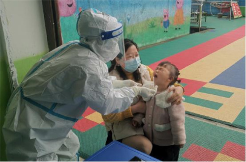 為確保土橋鎮(zhèn)各村小及幼兒園檢測工作的順利開展,土橋鎮(zhèn)衛(wèi)生院有序排班,提前通知學(xué)校把檢測場地按要求布置好,打印好學(xué)生健康碼并分發(fā)給每位學(xué)生,以班級為單位,10人為一組,學(xué)生手持健康碼按一米線排隊逐一采集。幼兒園的小朋友們年齡較小采集過程中相對較難,啟慧幼兒園一位小朋友非常緊張大喊:“漂亮阿姨!我會自己吃飯,不會哭臉,做個乖寶寶,可以不跟我打針嗎?”,我們采樣人員細心的解釋道“好,這不是打針,阿姨只是在你的嘴巴上輕輕地擦一下,把蟲子趕走,這樣就不會長蛀牙了,請你張大嘴巴啊啊啊,做個乖寶寶”。采樣人員耐心地一遍又一遍地重復(fù)著,小朋友在鼓勵下展現(xiàn)出幼兒的勇敢和堅強,非常配合核酸采樣,即使有些不適,也努力控制自己不亂動,大大加快了核酸采樣速度。采樣人員為了減少孩子們的不適感,蹲下來或者雙膝跪地為孩子采樣,這種敬業(yè)和大愛無疆的精神讓我們?yōu)橹磁搴蛣尤?,致敬白衣天使?/span>