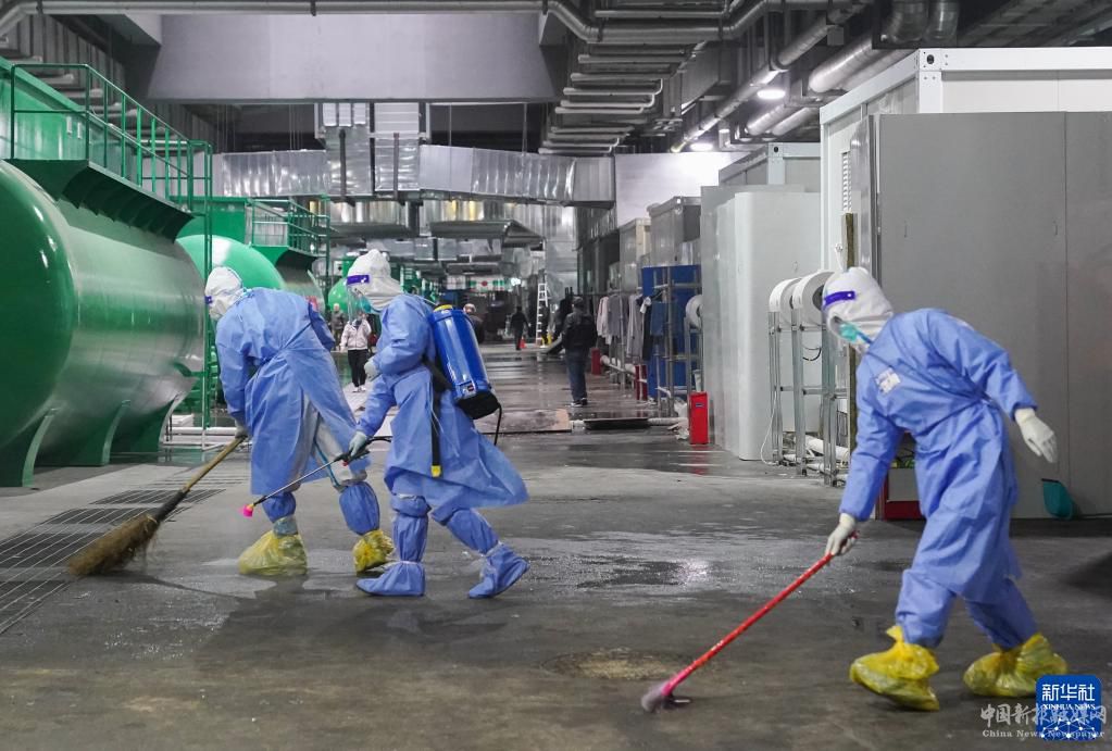 4月14日,在國(guó)家會(huì)展中心(上海)方艙醫(yī)院,醫(yī)護(hù)人員在進(jìn)行出艙前的消殺。新華社記者 丁汀 攝