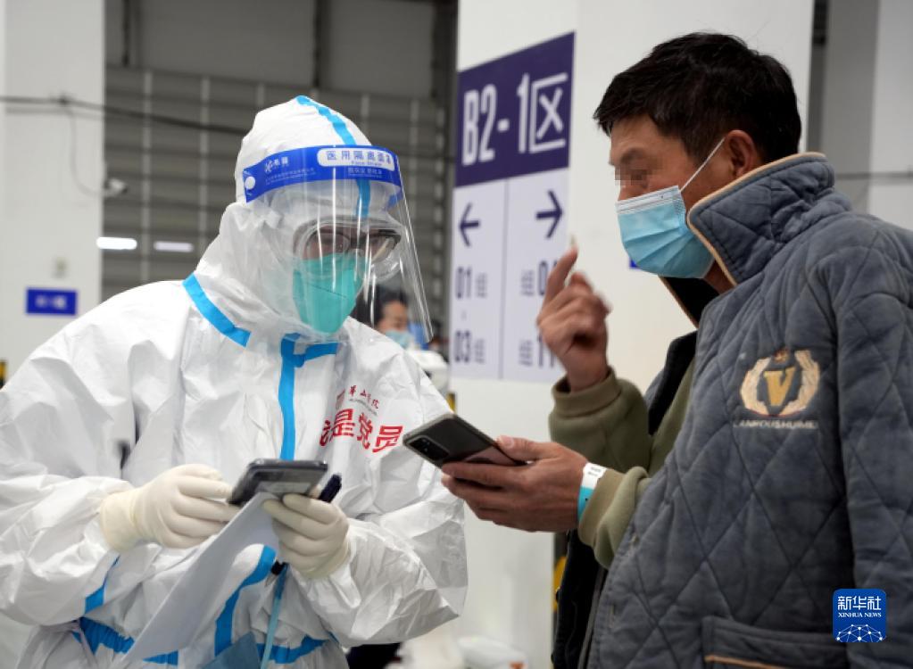 4月16日,方艙醫(yī)院的醫(yī)護人員幫助患者通過手機查詢核酸檢測結果。