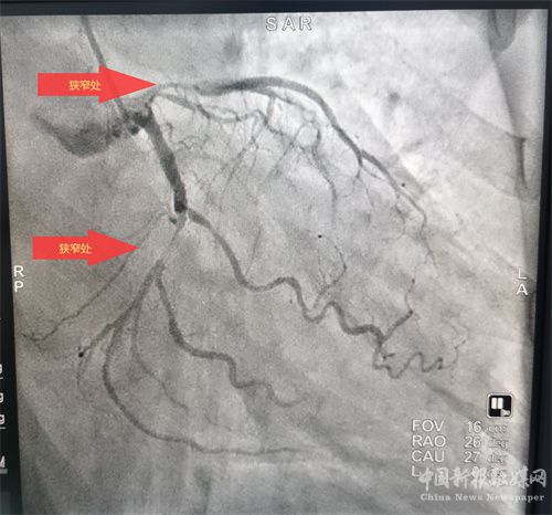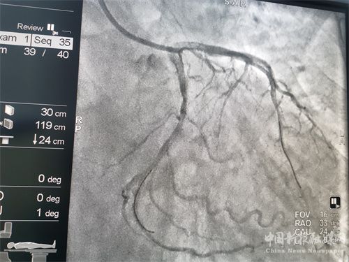 患者溶栓成功后,經(jīng)患者及家屬同意后行冠狀動(dòng)脈造影檢查,患者冠脈顯示前降支次全閉、回旋支狹窄95%、右冠近端狹窄85%,病情緊急,李維軍、楊亮主任向家屬詳細(xì)講明病情后,予以開(kāi)通前降支和回旋支,植入支架3枚。手術(shù)全程用時(shí)不到一個(gè)小時(shí)。目前,患者病情穩(wěn)定。