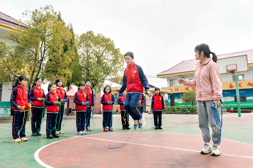老師正在指導(dǎo)跳繩興趣小組的學(xué)生跳繩。周亞茂攝