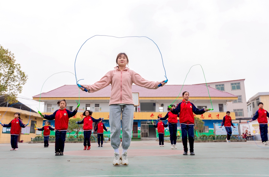 跳繩興趣小組的學(xué)生在老師的帶領(lǐng)下一起練習(xí)跳繩。劉平華攝