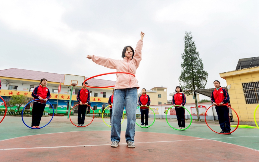老師在給呼拉圈興趣小組的學(xué)生做示范。劉平華攝
