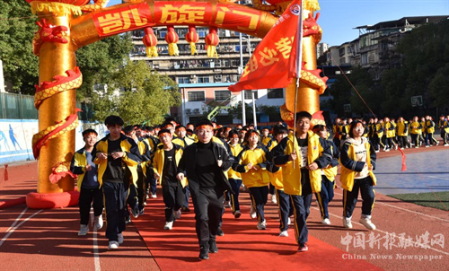 (初二初三學(xué)生在班主任的帶領(lǐng)下跑過凱旋門)