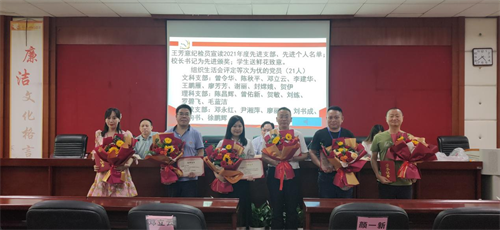 王芳意紀(jì)檢員代表學(xué)校宣讀2021年度支部民主評議等級為優(yōu)的黨員、2021年度優(yōu)秀黨員、優(yōu)秀黨務(wù)工作者和先進(jìn)黨支部名單。他在衷心祝賀的同時,也熱情勉勵全體黨員向先進(jìn)們學(xué)習(xí),以“平常時候看得出來,關(guān)鍵時刻站得出來,危難時刻豁得出來”的精神為黨的教育事業(yè)建功立業(yè)。鄧校長和鄧書記為先進(jìn)們頒發(fā)了榮譽(yù)證書,活潑可愛的學(xué)生向先進(jìn)們奉獻(xiàn)了鮮花致意。