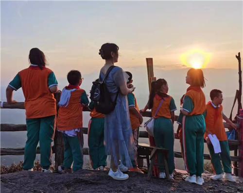 在悉心輔導(dǎo)孩子們英語學(xué)習(xí)的基礎(chǔ)上,為進(jìn)一步提高他們對英語的興趣,經(jīng)過前期的科學(xué)安排,在家長的全程陪同下,8月14日,許秋萍老師同身穿綠色校服的孩子們腳踏月色,身披星光,共同前往世界自然遺產(chǎn)地、國家5A級景區(qū)崀山內(nèi)的八角寨開展英語夏令營活動。在登頂?shù)倪^程中,大家相互鼓勁,相互加油,經(jīng)過一個小時左右的攀爬,大家順利登頂。此時個個臉上掛滿汗珠,口里喘著粗氣。片刻間,當(dāng)一輪紅日正從東方冉冉升起時,“Beautiful!”不知誰忘情地說一句,驚呼聲與尖叫聲在山頂交織著。