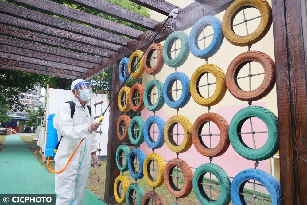 ↑2022年8月31日,江蘇省南通市南通師范第一附屬小學(xué)幼兒園的工作人員在進(jìn)行消殺作業(yè)。CICPHOTO/徐培欽 攝