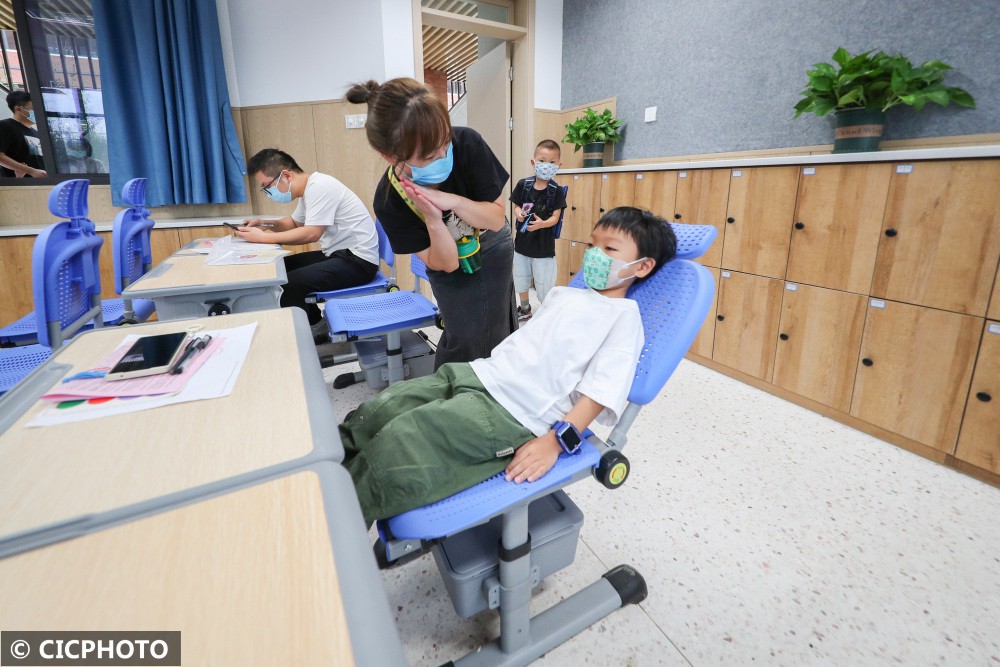 ↑2022年8月31日,浙江省湖州市德清縣鳳棲小學(xué),一年級新生在體驗(yàn)午睡椅。CICPHOTO/蔡俊 攝