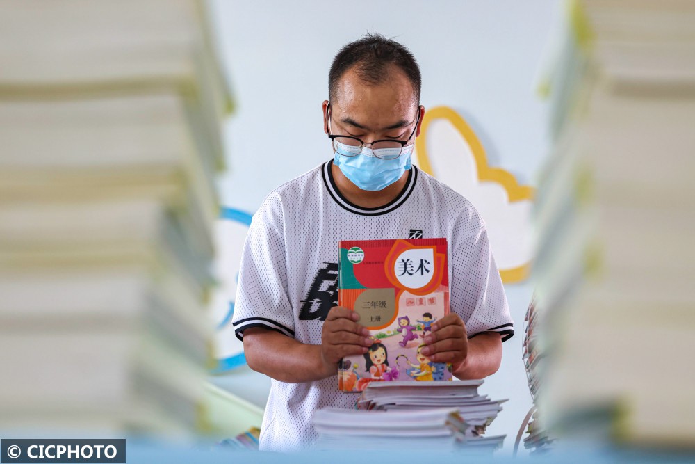 ↑2022年8月30日,新疆庫車市第十小學(xué)的教師在對教材進(jìn)行歸類和配發(fā)。CICPHOTO/袁歡歡 攝