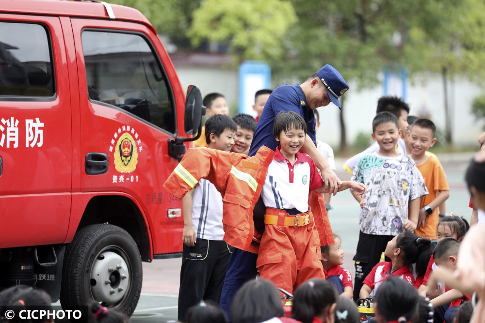 ↑2022年8月30日,湖南省資興市第二完全小學(xué)的學(xué)生們在消防救援人員的指導(dǎo)下體驗(yàn)穿著搶險救援服。CICPHOTO/李科 攝