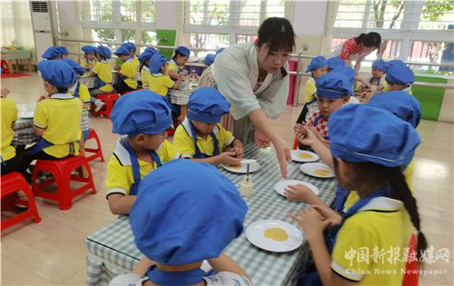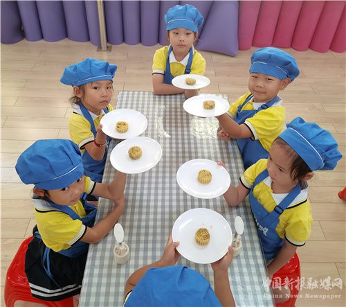 2022年9月7日,安徽省合肥市廬江縣崗灣街道達(dá)觀天下幼兒園,一家本地月餅制作企業(yè)的高級面點(diǎn)師正在帶領(lǐng)孩子們制作中秋月餅。