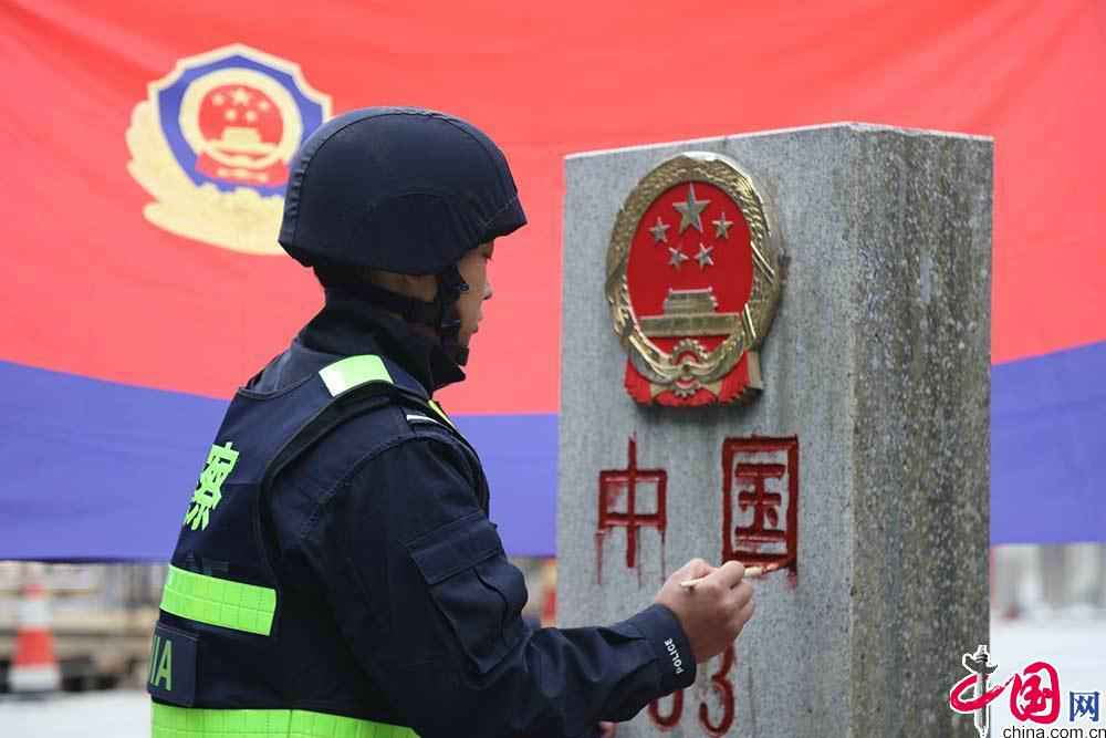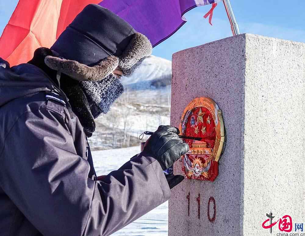 巡邏民警為嚴(yán)寒侵蝕凋色的中蒙邊境110界碑描紅添色。呂昊俊攝