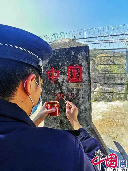 云南清水河出入境邊防檢查站民警為中緬S122號界樁描紅。