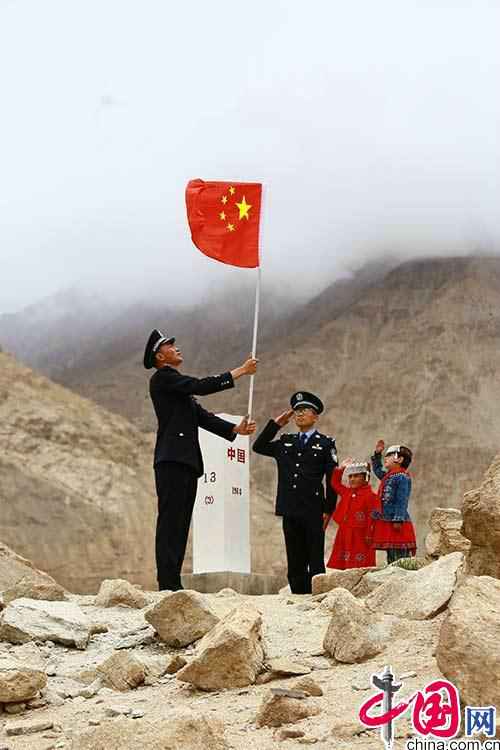 新疆出入境邊防檢查總站喀什邊境管理支隊(duì)民警在中國-巴基斯坦邊境13號界碑前舉行升旗儀式。