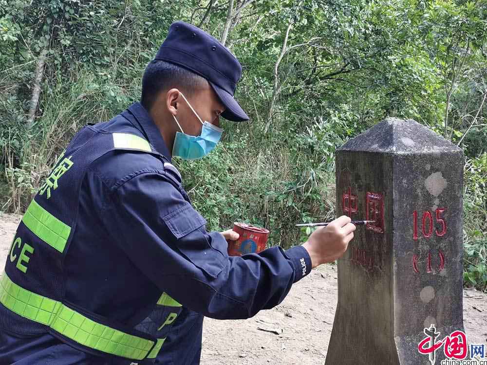 云南臨滄南傘邊境派出所民警為中緬125界樁描紅。