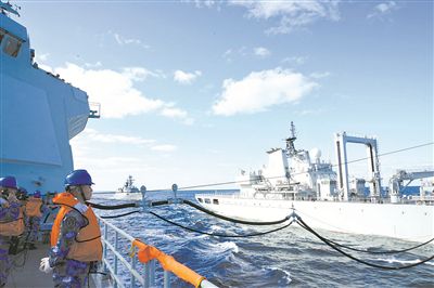 參演艦艇進(jìn)行海上補(bǔ)給。