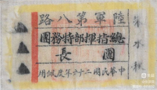 “ 這是家父到達(dá)延安后,調(diào)任八路軍總司令部警衛(wèi)團(tuán)團(tuán)長時(shí)佩戴的綿布胸標(biāo),正面寫著“陸軍第八路軍總指揮部特務(wù)團(tuán)團(tuán)長,中華民國二十六年度佩用”,左側(cè)為“朱水秋”三個(gè)字。背面寫著“特字第一號(hào),盡忠職務(wù),嚴(yán)守紀(jì)律,實(shí)行主義,完成革命。”