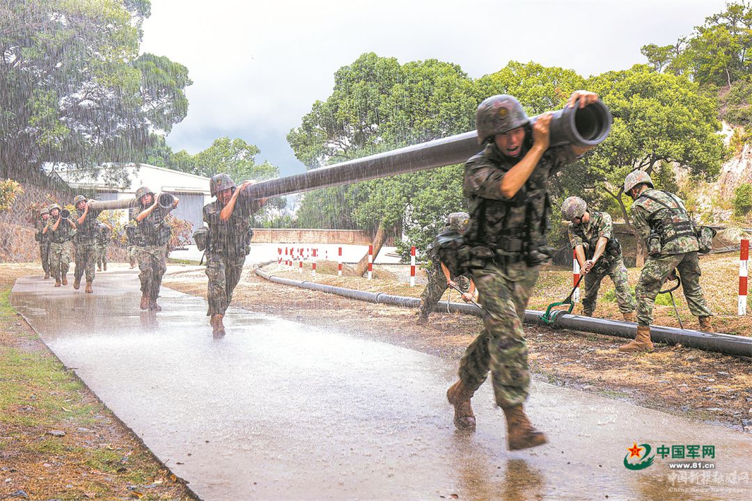 聯(lián)勤保障部隊某團官兵冒雨開展管線鋪設(shè)演練。張佳豪 攝