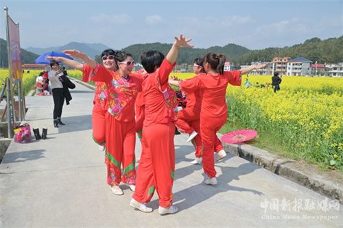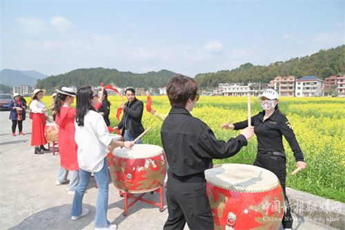 陽春三月,草長鶯飛,超級雜交水稻基地種植的數(shù)百畝油菜花陸續(xù)綻放,田野鄉(xiāng)村金浪涌動、流光溢彩,將田野與村莊、農(nóng)舍裝扮得格外迷人,美不勝收。放眼望去,遍地金黃,構成了一幅春意盎然的美麗鄉(xiāng)村畫卷。置身花海,淡淡的花香撲鼻而來,讓人心曠神怡?;êV校瑪z影師“卡嚓卡嚓”快門聲不斷,在捕捉每個精彩的瞬間。手鼓隊帥哥美女,現(xiàn)場激情表演,吸引游客駐足觀賞。黃金井村中老年健身隊,自帶音響,踏歌踏舞,盡情釋放美麗的心情......