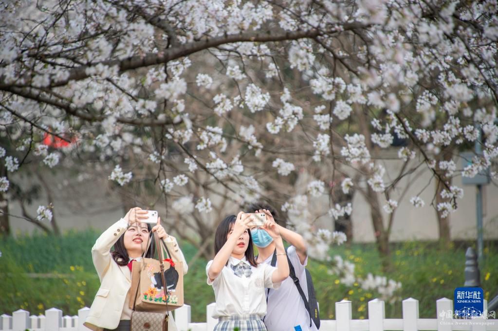 柔風(fēng)漸暖,湖北武漢東湖櫻園的櫻花競(jìng)相綻放,吸引眾多市民前來(lái)游園觀賞。