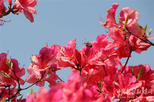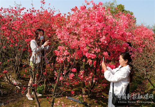 人間芳菲四月天。2022年4月2日,周六,安徽省合肥市廬江縣白湖鎮(zhèn)鄧湖村上萬(wàn)株野生映山紅陸續(xù)開始綻放,在春日暖陽(yáng)照耀下,如云似錦,遍布村頭,一團(tuán)團(tuán),一簇簇,在春日新綠的映襯下分外美麗,蜜蜂在花朵間飛舞采蜜。遵循疫情期間減少外出旅游的要求,來(lái)自廬江當(dāng)?shù)氐氖忻瘛⒋迕窦娭另硜?lái),徜徉花海,趁著春日暖陽(yáng),盡情享受“家門口”這極具詩(shī)情畫意的生態(tài)景色。