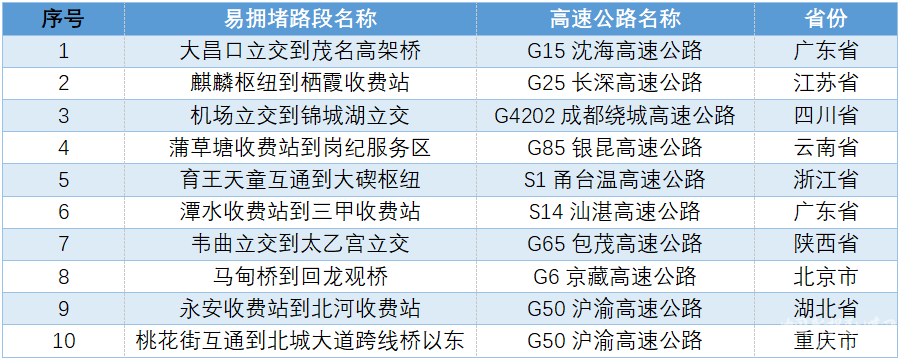 易擁堵緩行路段。假期期間,預(yù)計全國高速公路出程、返程易發(fā)生擁堵緩行的路段,如下表所示。