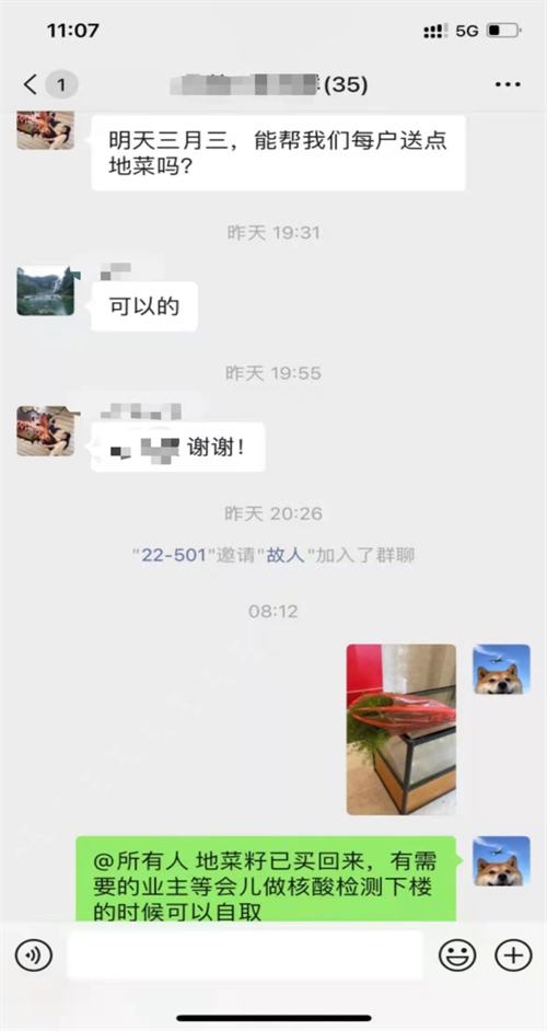 “阿姨,您要的蔬菜我已經(jīng)放在柜臺了”“叔叔,您在興盛優(yōu)選定的貨品到了,東西都全,給您放柜臺了”“地菜籽買回來了,大家有需要的可在下樓做完核酸檢測后自取”······黨員志愿者用一個個善意的微笑,一句句貼心的話語,一次次溫情的服務(wù),讓居家隔離人員感受到了心靈的溫暖。