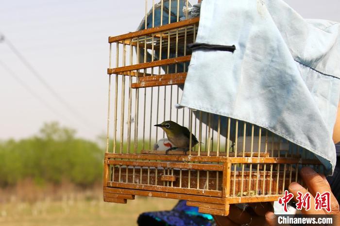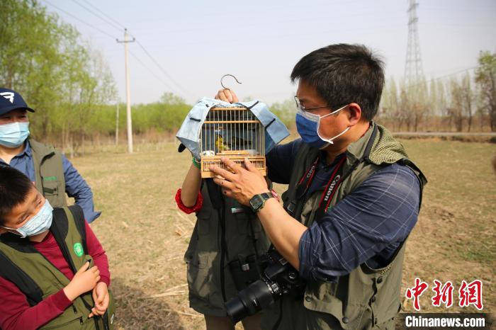 圖為志愿者打開(kāi)鳥(niǎo)籠放飛暗綠繡眼。 黃杉杉 攝