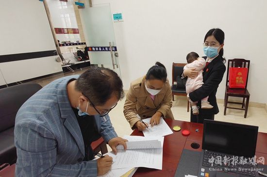 4月14日,湖南省隆回縣人民法院書記員羅嫻(右一)為當事人抱著小孩,方便當事人現(xiàn)場閱讀庭審筆錄和簽字。當天,該院審理一起民間借貸糾紛,一女性當事人抱著哺乳期小孩參加訴訟活動。羅嫻現(xiàn)場為當事人“抱小孩”的親民小舉動,體現(xiàn)了該院法官和司法輔助人員常懷親民之心、辦親民之事、行利民之舉的宗旨意識。(賀上升 張善偉 攝影報道)