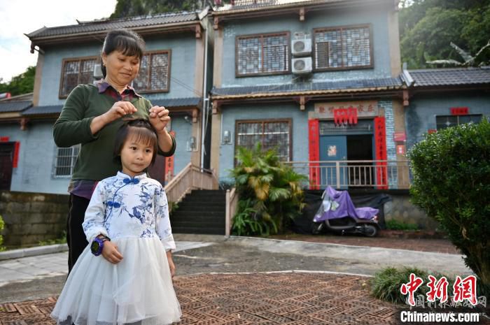 圖為浩坤村三合屯一村民在自家民宿前為孩童梳妝?!∮峋?攝