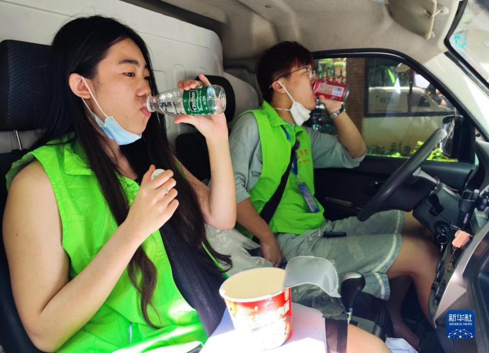 8月14日,張海洋(右)、吳凡力在貨車上吃午飯。新華社記者 郭程 攝